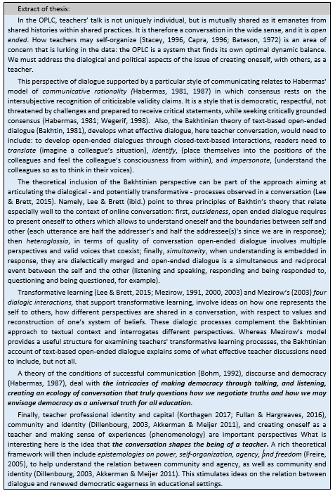 This is a question I often get. As my research indicates, conversation is a broader concept than dialogue. Dialogue is but one of the components of conversation, which stretches beyond dialogical structures. Conversation in the Online Professional Learning Community (OPLC) I studied was the ensemble of interactions AND the space in which these interactions occur and was a central and crucial activity and medium for learning.